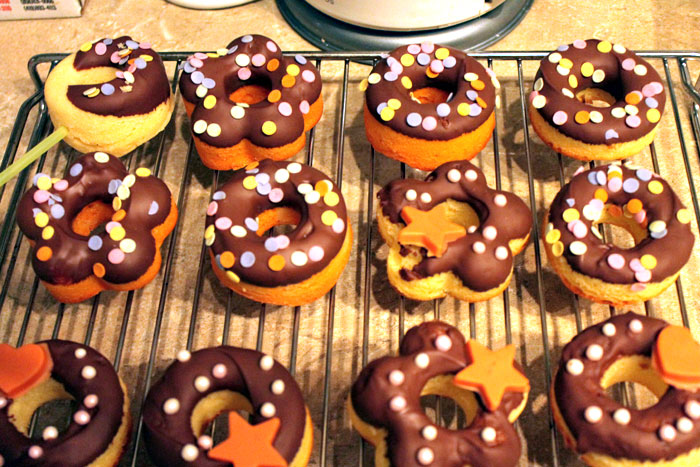 で、私は焼きドーナツを焼いて行ったのさ、チョコレートでデコったり、キャンディの棒をつけて子供も持ちやすくしたりして。