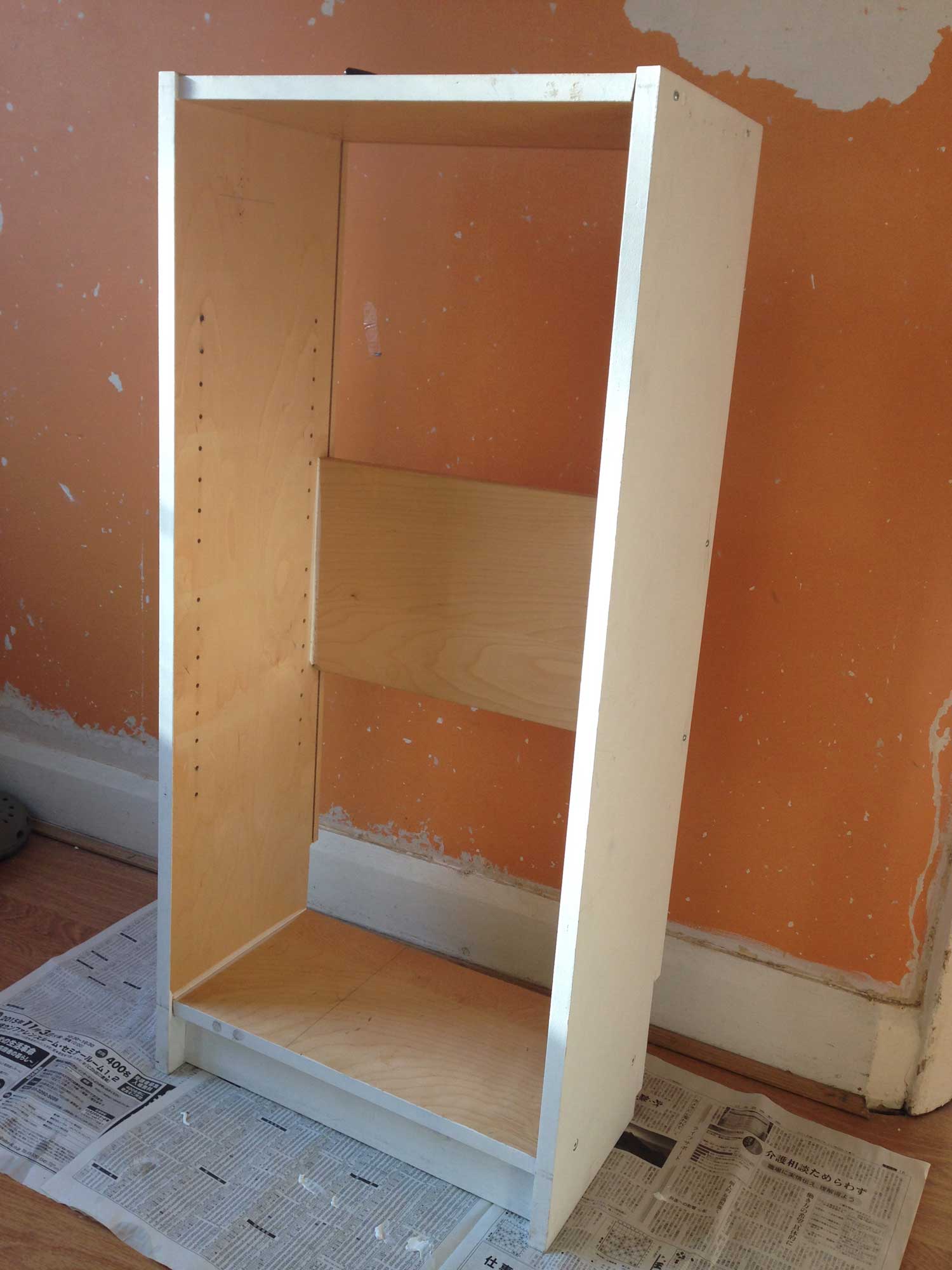 いらなくなった本棚があるので捨てようと思ったけど、子供のコート掛けがないので不便なことに気づき写真のIkeaの本棚をリメイクすることに決定。