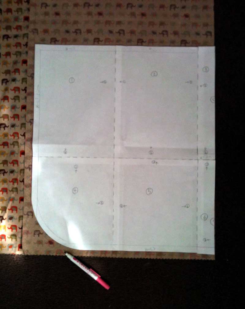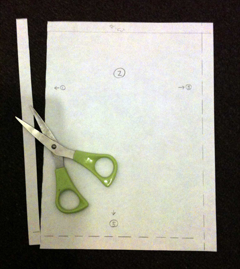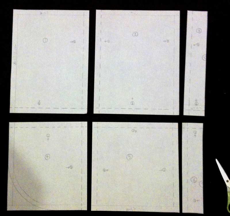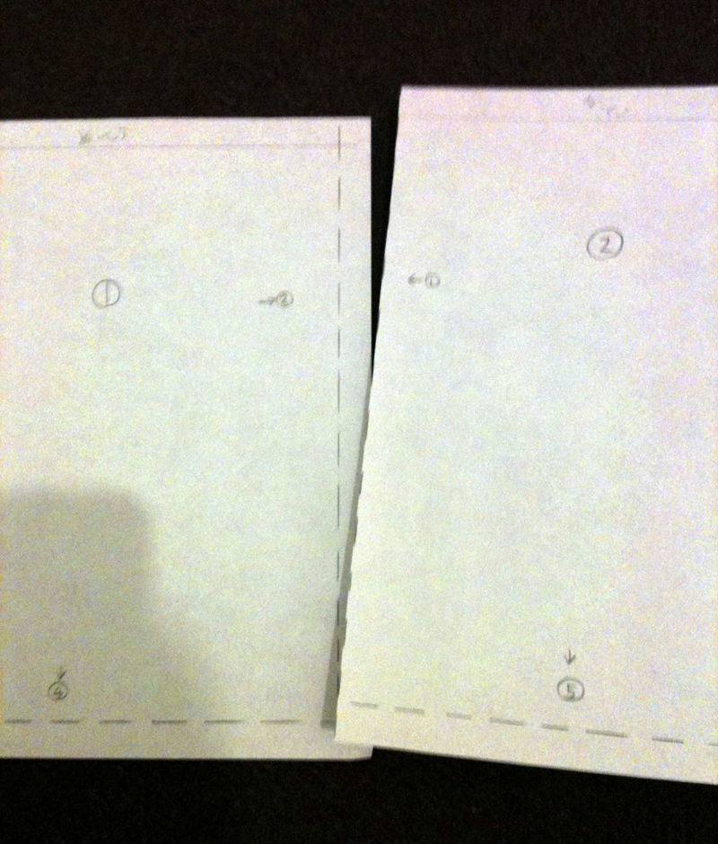 (実際の型紙は1番の紙の肩部分に肩ベルトの差し込み口とちょっとしたカーブが入っています。)