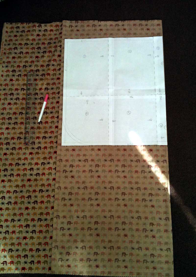 表地を「わ」になるように中表に折って本体の型紙を布の上の方においてチャコペンで型を取る。