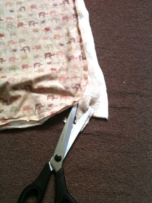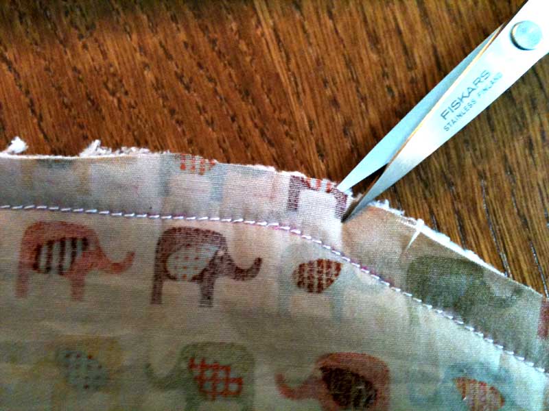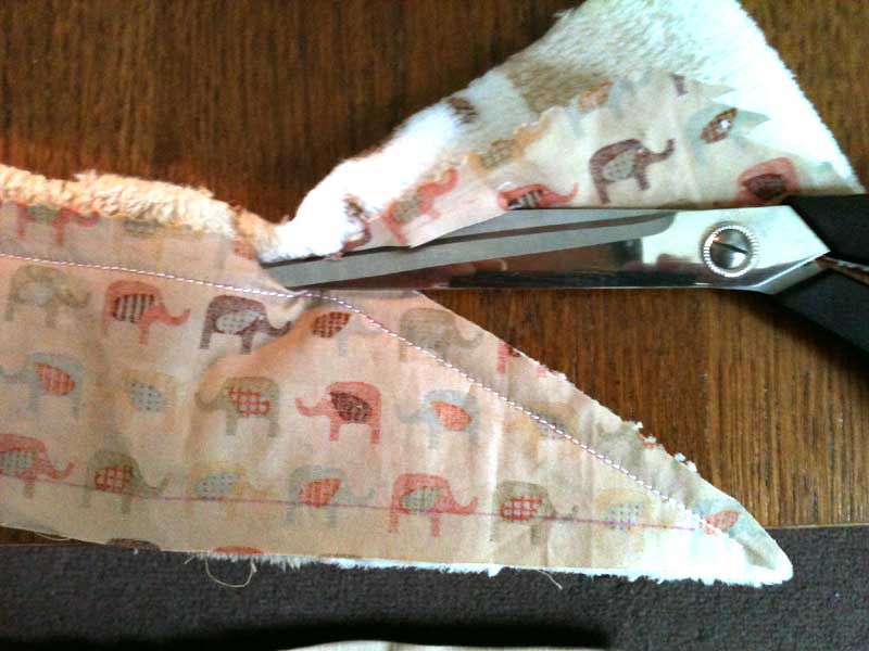 縫い終えたら、表地に沿って余分な裏地をカット、そしてカーブのある所に切り込み。