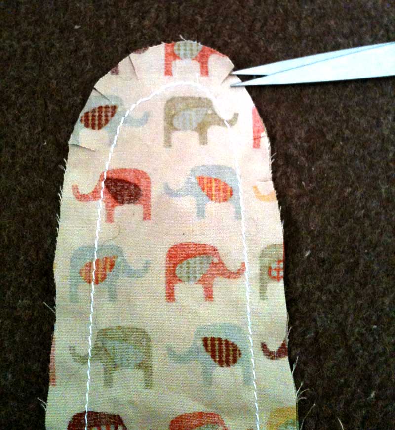 カーブになっている所の縫い代を縫い糸を切らないようにハサミで数か所切り込みを入れます。