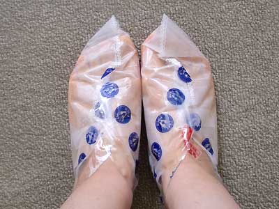 足を清潔にしたらよく拭いて、液の入った袋に入れます。